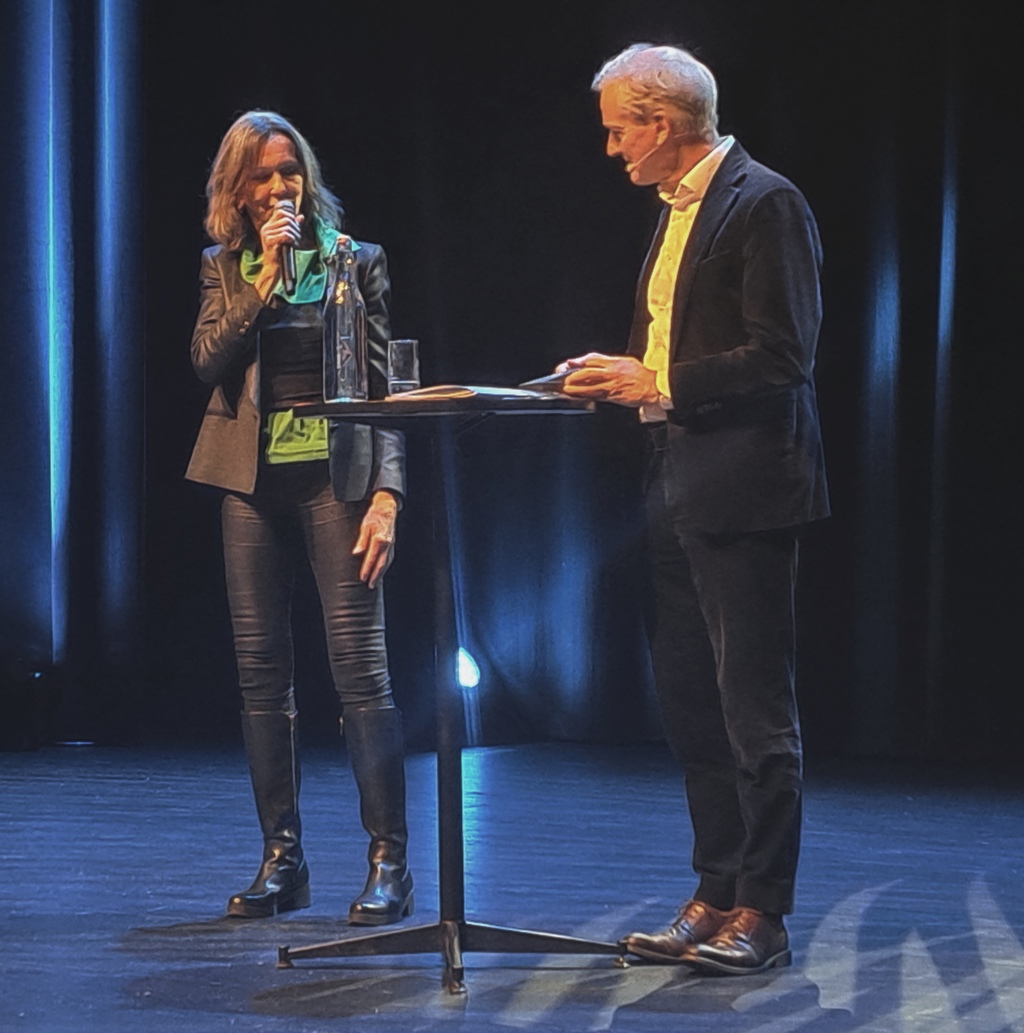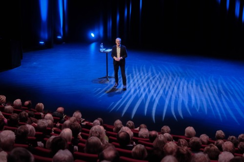Etter foredraget fikk statsministeren langvarig applaus, og en larvikitt-gave av Pensjonistuniversitetet ved styreleder Kari Line Roald.